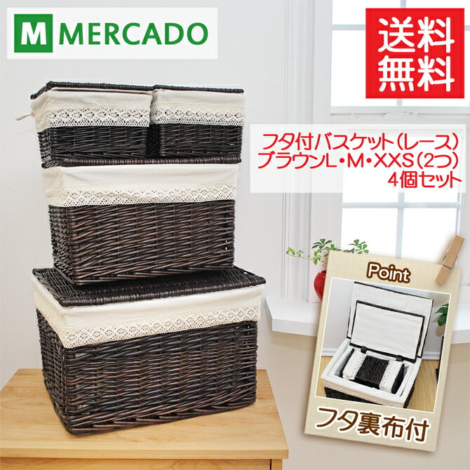 ★送料無料★セットでお買い得!フタ付きバスケット(レース) ブラウン XXS(2個)&M&L 4個セット価格: 3,980円レビュー評価: 4.81 レビュー数:16 内布付きなのでタオル等、中の物がカゴに引っかかったり、傷ついたりせず収納できます。 また、内布はバスケットから取り外して洗濯できるので、いつも清潔に使っていただけます。 フタ付きなのでホコリが入りにくく、バスケットの中身が見えません。 また、フタとバスケットをつなぐベルトを合皮にしてマジックテープで留めてあるので、 簡単に取り外すことが出来きます。 製品の加工上、どうしても出てしまうカゴの編み終わりで他のものを傷つけたり、 小さなお子様がケガをしないように、フタの裏に生地を付けました。 ※商品の特性上、フタ裏の布のサイズにバラつきがございます。そのため、全ての編み終わりを布で カバーできていな |